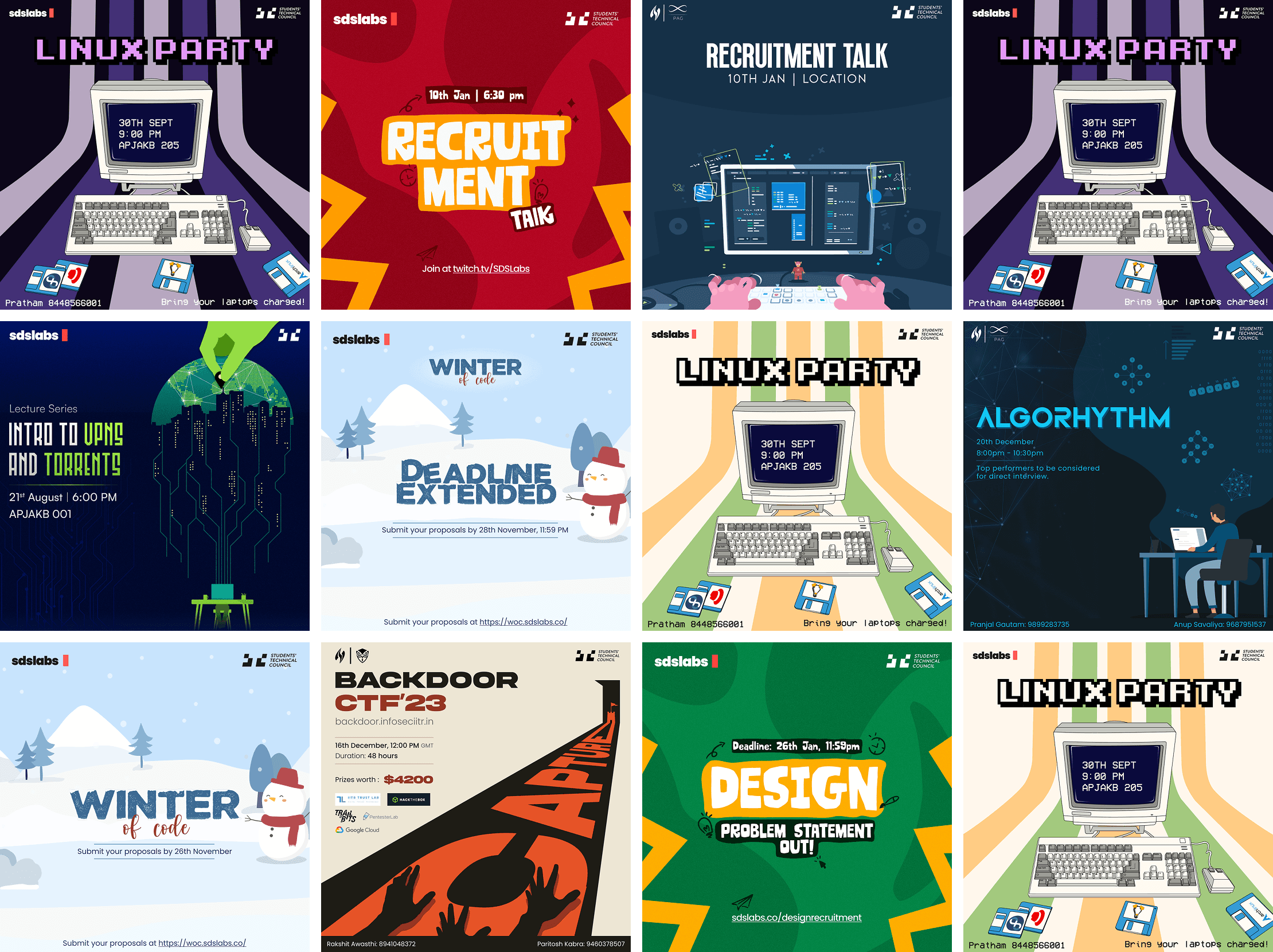 Being a Designer in SDSLabs, a student-run Software Development Section at IITR, I have designed multiple posters for different events organized by our club. Most of these are illustrative posters, hence mostly done on Figma, sometimes Adobe Illustrator, and seldom Adobe Photoshop.